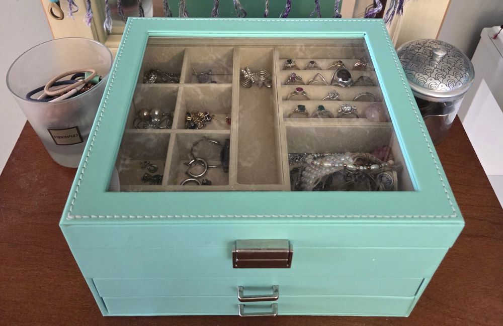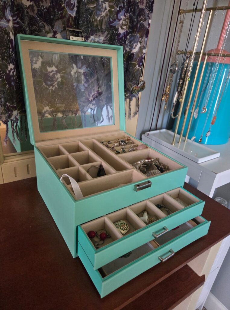 There’s a story behind why I bought a new jewelry box a few years ago after decommissioning the old wooden one I found at a thrift shop and covered in seashells (like many things, this story involves young kids) but I did some comparison browsing and am glad I settled on this one. For one, it’s such a pretty colour (I chose light turquoise/mint but there are other lovely options) and the window in the lid makes it easy to peek inside and view its top contents, spared from collecting dust. The faux leather material, as opposed to a hard wood, is nice and soft. Its lower two drawers with multiple earring and bracelet compartments, in addition to the top level that also includes ring storage, make it a convenient solution for storing and organizing various types of jewelry.