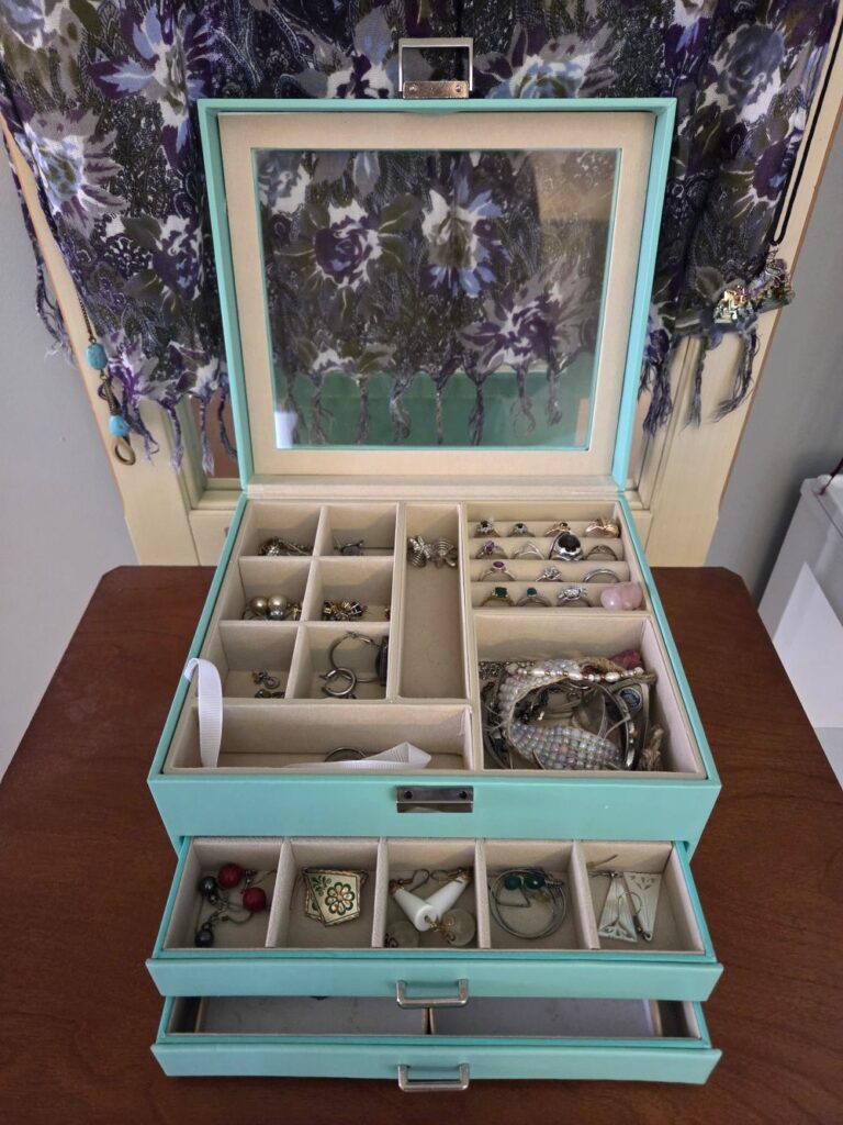 The only downside to this jewelry box is that the strap connecting the top of the lid to the base broke at some point over the years. This isn’t an issue for my jewelry box since sits in front of a standing vanity mirror and the lid rests against it when open. However, if there isn’t anything supporting the lid from behind, it would fall open at an 180° angle (instead of the 95-ish° angle that the strap would have allowed while taut). If you situate the box on top of a table or dresser against the wall, it won’t be an issue. But consider the space behind if you plan to have your jewelry box in the middle of a surface.